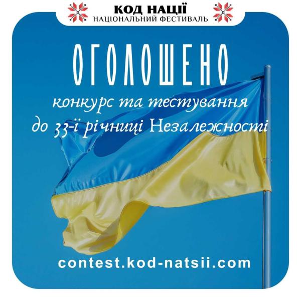 Національним Фестивалем “Код Нації” оголошено проведення Всеукраїнського конкурсу творчих проєктів “Код Нації” до 34-ї річниці Незалежності України. Головною метою Конкурсу є створення творчих проєктів - художніх, декоративно-ужиткових, вокальних, хореографічних, сценічних та інших - відповідно до його тематики, з метою розвитку та утвердження в українському суспільстві культурних, освітніх, духовних і патріотичних цінностей. Конкурс спрямований на популяризацію української мови, культури та народних традицій, а також на осмислення сучасного “Коду Нації” через автентичну спадщину, історію й звичаї українського народу. Окремим завданням є підтримка Збройних сил України шляхом збору благодійних внесків від учасників. На Конкурс усі охочі можуть подати власні творчі проєкти у дев`яти номінаціях: образотворчі роботи, відеороботи, есе на тему “Настане день, закінчиться війна…”, авторські прозові твори, жартівливі, фотографічні, музичні, хореографічні та декоративно-ужиткові роботи. Подача заявок на Конкурс відбувається на сайті: https://contest.kod-natsii.com/ з 21.07 по 20.08, оцінювання творчих проєктів по 20.08, а оголошення переможців Конкурсу відбудеться 23 серпня на офіційних сторінках Фестивалю в соціальних мережах. Також, Освітня платформа Фестивалю оголошує про проведення Тестування: 34 роки Незалежності, де усі охочі мають чудову можливість перевірити знання щодо історії нашої Незалежної України! Зареєструватись на нього можна на сторінці: https://contest.kod-natsii.com/test/ з 21.07 по 20.08, скласти тестування з 01.08 по 31.08, а отримати Сертифікат знавця Незалежної України одразу після складання тестування! Детальніше про умови участі та Положення на сайті Конкурсу: https://contest.kod-natsii.com/